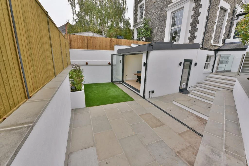 Around one metre of ground was regraded to achieve a continuous, level transition between the lower ground floor and the outdoor space.