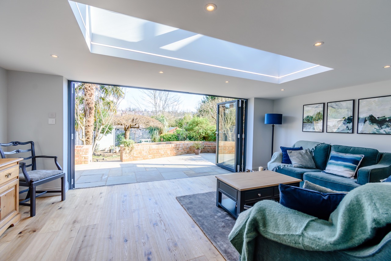 The new extension opens directly onto the garden, creating a light-filled, cohesive environment that balances contemporary comfort with the historic character of the home.