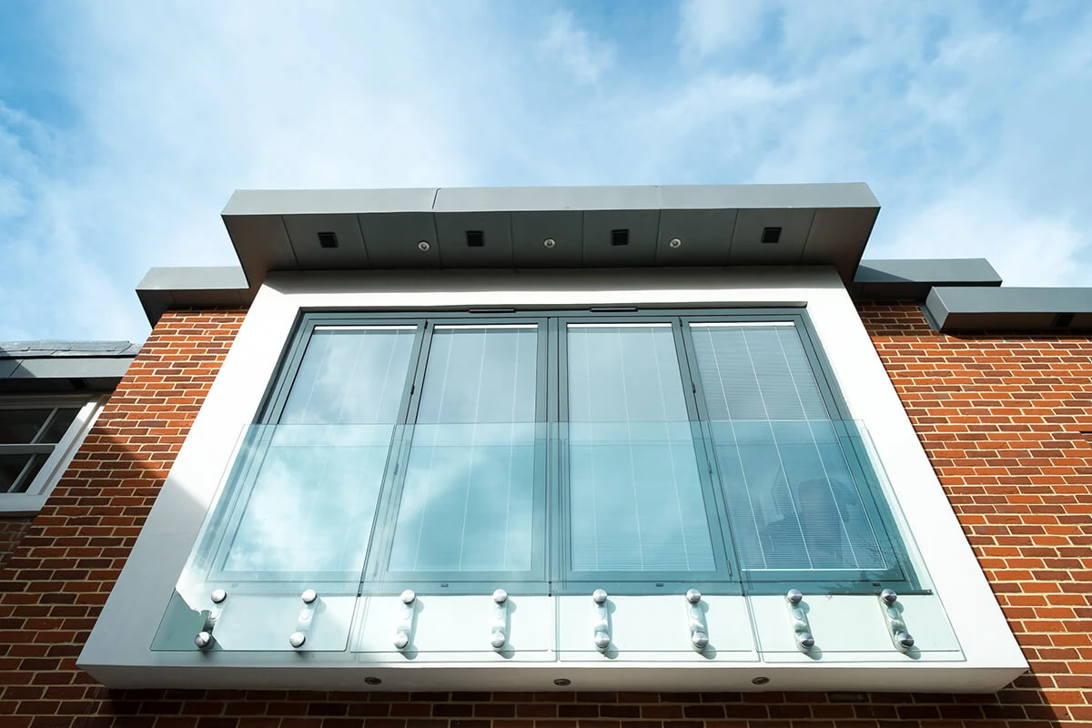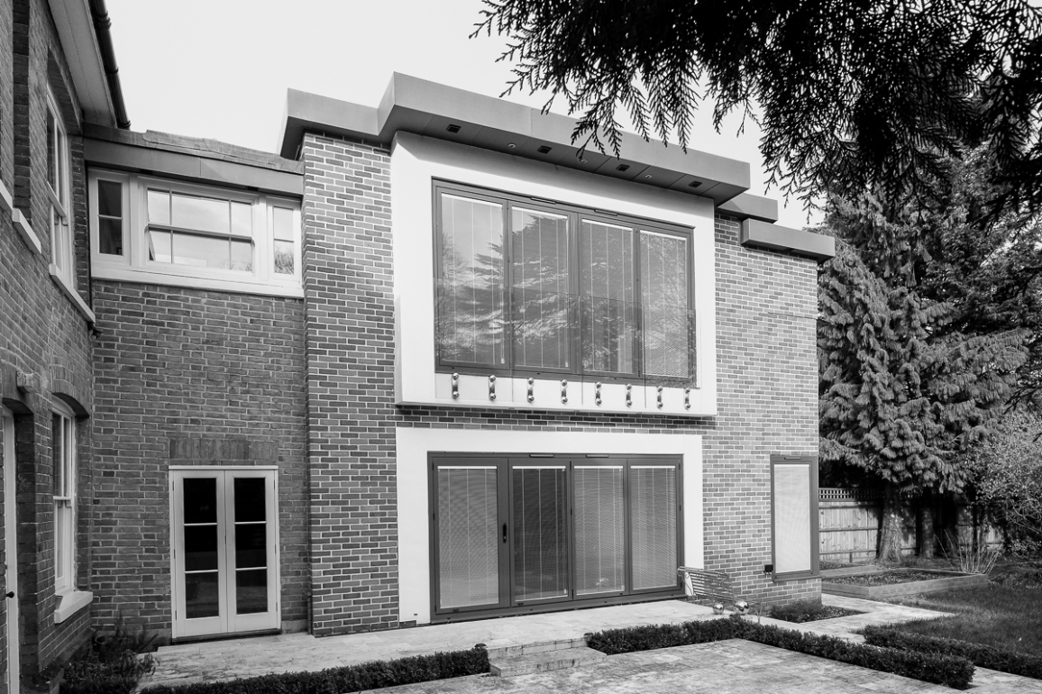 The final design features a shallow-sloping zinc roof and a projecting rendered first-floor bay window set within a brick façade. This element provides shading for the ground-floor bi-fold doors while creating visual interest on the front elevation. The extension accommodates a dining room and study on the ground floor, with a master bedroom, dressing room, and ensuite on the first floor.